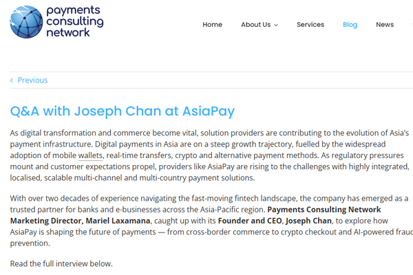 In a recent feature by Payments Consulting Network (PCN), our CEO and Founder, Joseph Chan, sat down with Marketing Director Mariel Laxamana to discuss how AsiaPay is redefining digital payments across Asia and beyond.